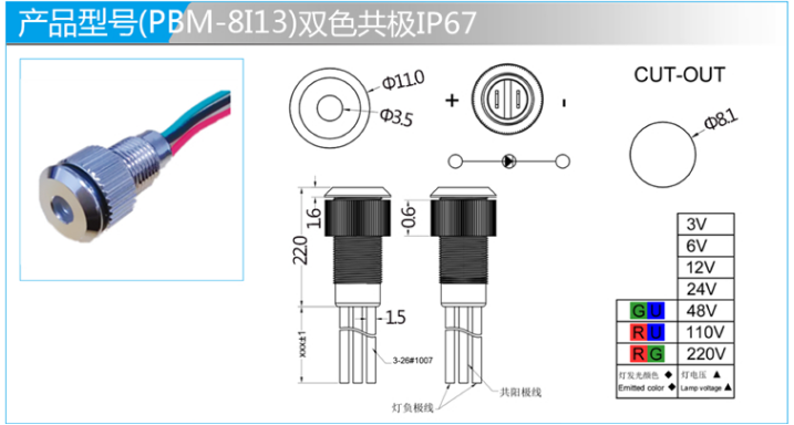 产品简介:小型信号指示灯,内部防水,灯的亮度可调,单色、双色共极功能选择