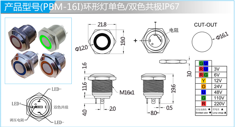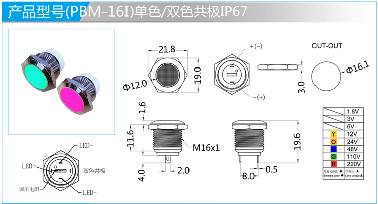 内部防水指示灯,整体发光或环形发光的选择,单色、双色共极,可配线。